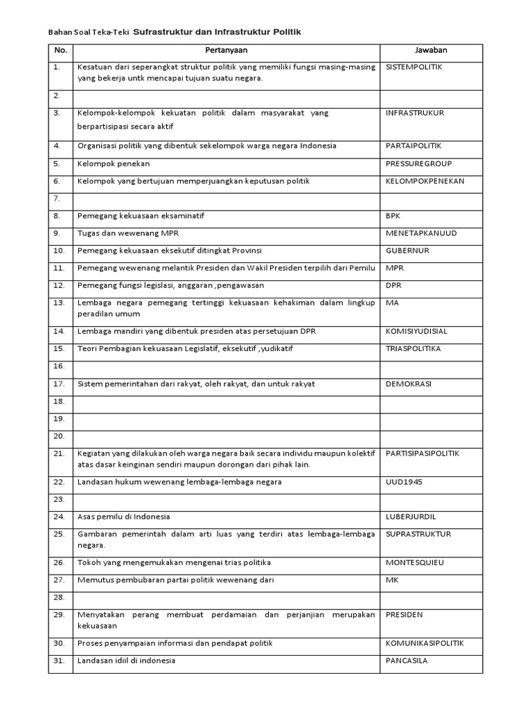 Contoh soal tentang suprastruktur dan infrastruktur politik. We did not find results for: Check spelling or type a new query. Maybe you would like to learn more about one of these?
